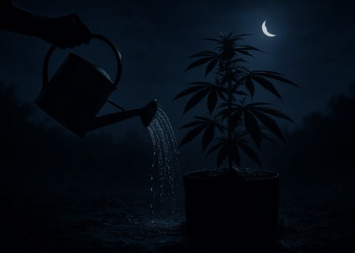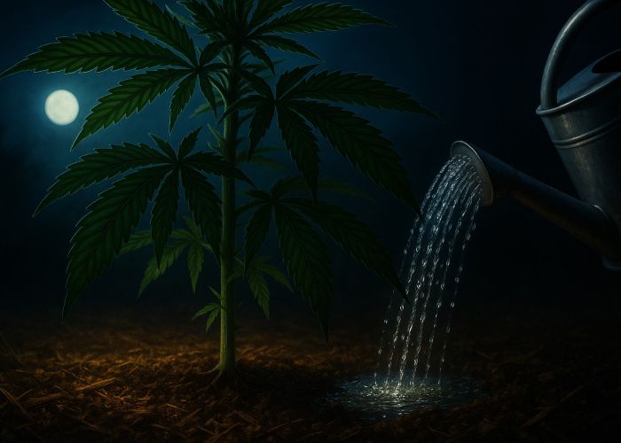 На этом фоне вечерний или ночной полив выглядит гораздо привлекательнее. Когда солнце опускается, почва начинает остывать, испарения резко снижаются, и вода проникает глубже, дольше удерживаясь в зоне корней. При этом растение уже вышло из стадии пассивной защиты: устьица на листьях снова открываются, возобновляется транспирация, активизируются ферментативные процессы. Это «окно восстановления» длится недолго, но при правильном поливе позволяет каннабису максимально эффективно использовать влагу, полученную после жары.